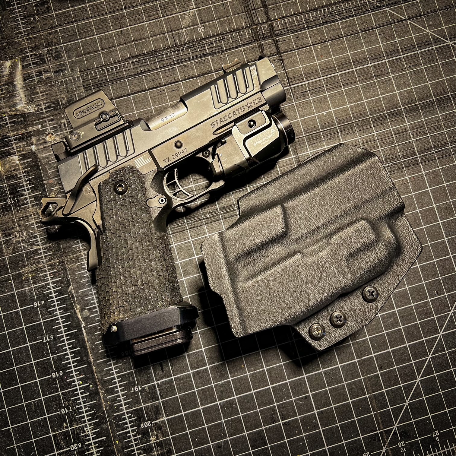 This is our “Secondary” OWB Kydex Holster designed to fit the popular Staccato C/C2 with the Streamlight TLR-7/A light attached. This holster will accomodate other 2011s with the TLR7/A attached however it is cut at the 3.9″ length for the Staccato C/C2. If running longer barrel 2011 the barrel portion will stick out of the holster, however it will still retain and function as designed. This holster is black in color and made for right handed shooters. This holster comes equipped with angled belt loops accommodating belts up to 1.75″ in width.