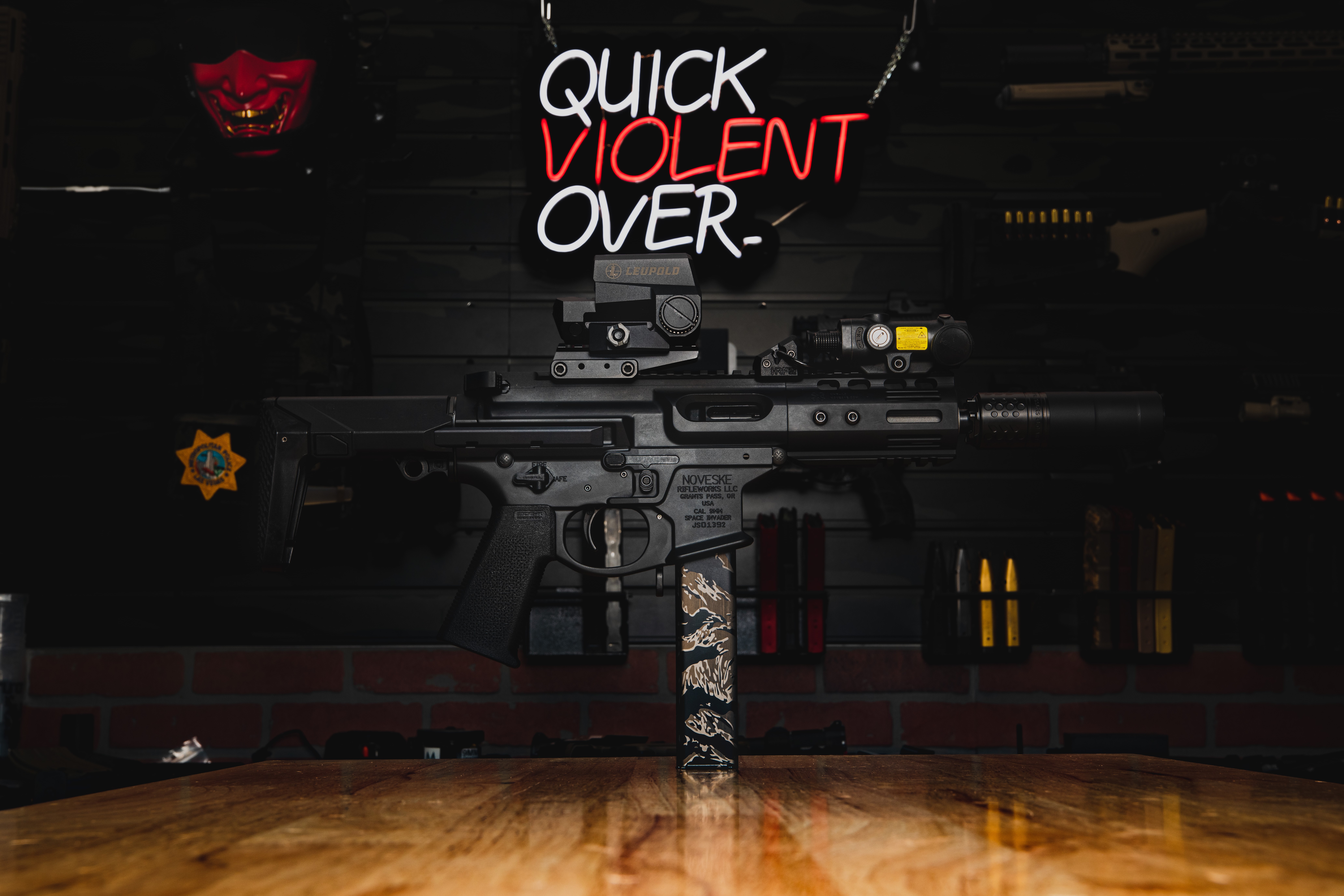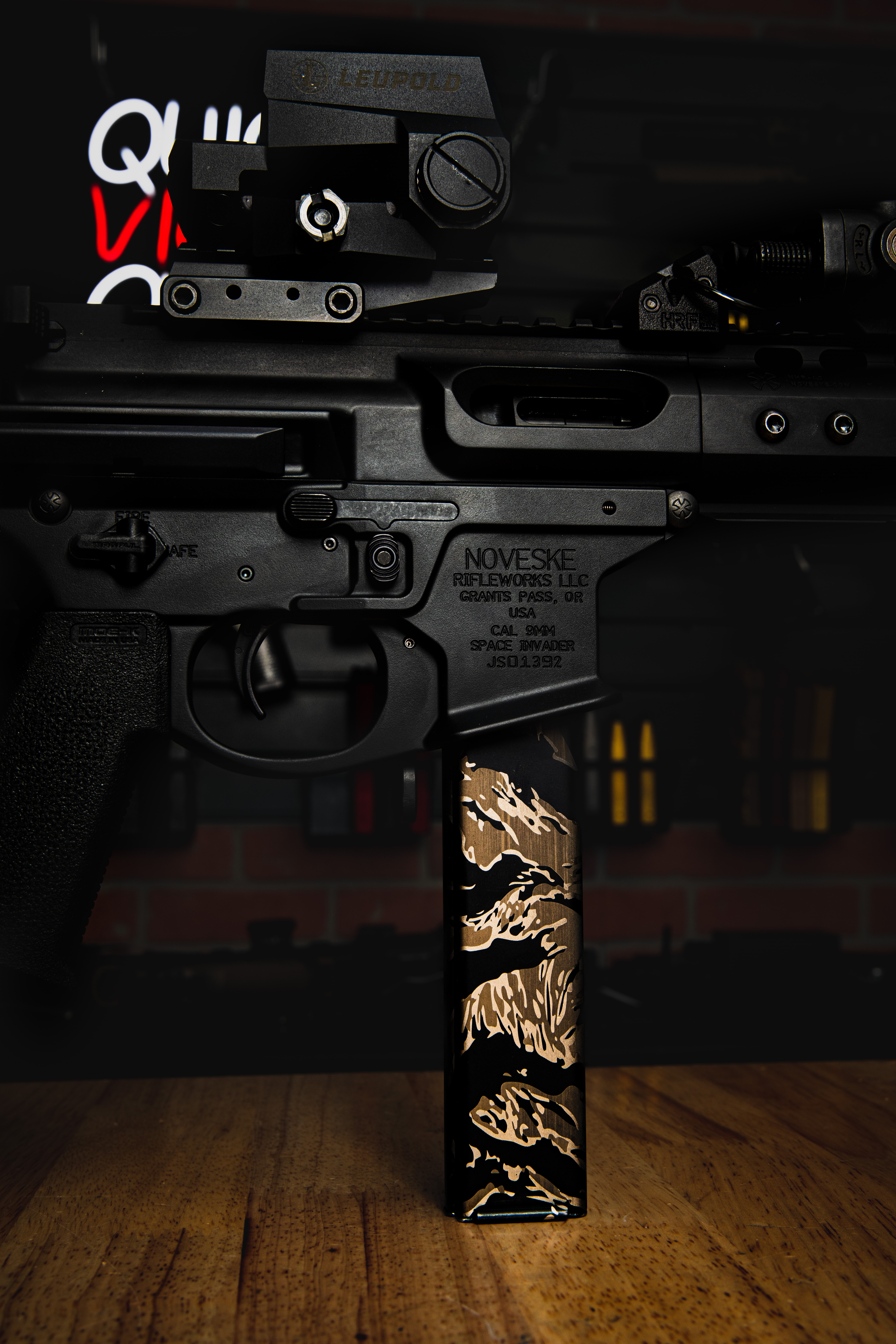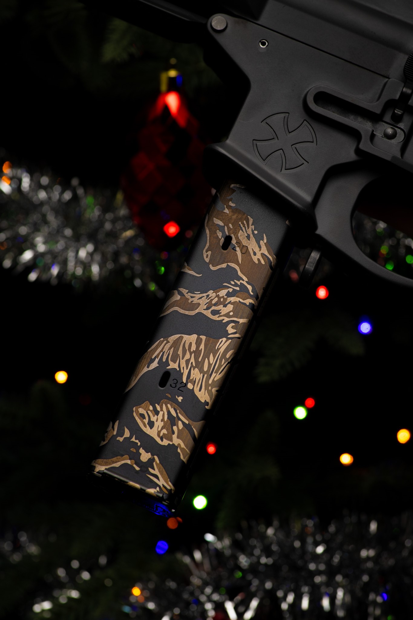 These are our Duramag Colt 9MM magazines laser engraved to pull out different pigments of the black stainless steel metal. This effect gives us different colors in the magazine allowing us to make a cool Tiger Stripe Copper pattern but with desert-like colors. We’ve spent quite a bit of time figuring out the different frequencies, power levels and line widths to use with our fiber laser to produce these and we are very please with the result. We think you will be also!